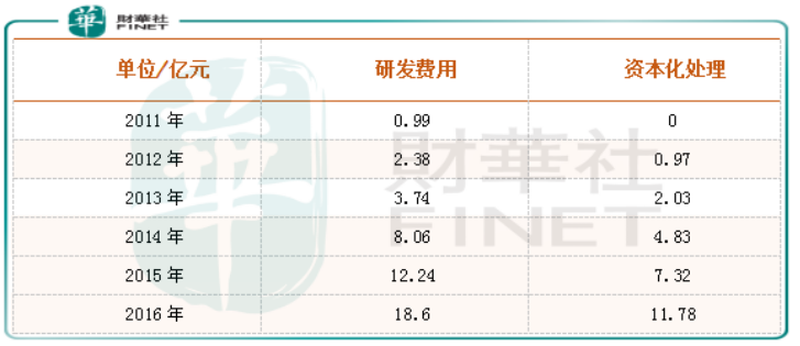 2011年至2016年乐视网研发费用图表: