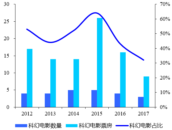 与此同时,科幻片多以3D、IMAX特效格式呈现,单票价较高,盛产头部影片。2012-2017年北美TOP10电影中科幻题材数量稳定在3-5部,票房占比约40%左右。