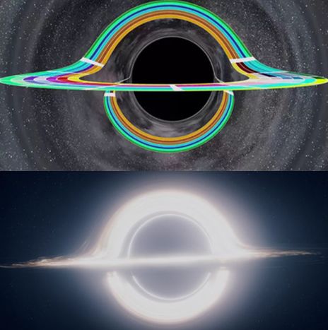 影片的黑洞特效制作均是基于索恩的引力透镜公式,建立全新渲染软件制作而成,堪称物理学上最准确描述黑洞的视觉呈现。