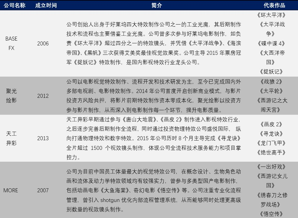 龙头影视特效公司已初步具有较完整的项目流程管理能力,将受益于制作方特效投入的提升。根据艺恩调研显示,目前中国视效公司品牌认知度排名前三的公司为Base FX、聚光绘影和天工异彩,这三家公司均拥有较为稳定的客户源以及一定的创新能力,而MORE、楷魔视效、诺华视创等新锐公司也逐渐崭露头角。