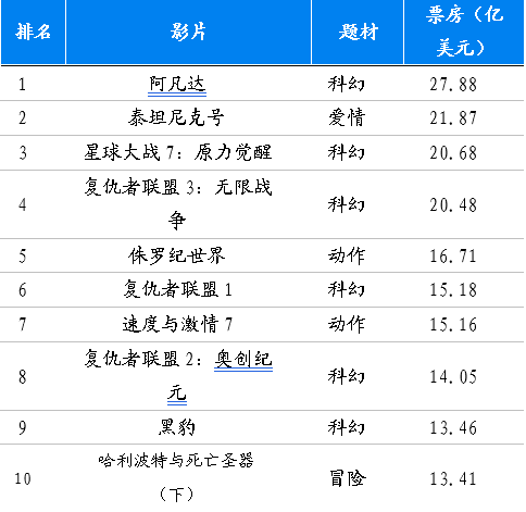 北美票房TOP10中科幻电影占比高(亿美元)