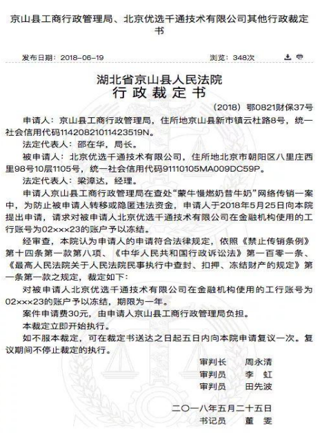 湖北省京山县工商局方面向相关媒体证实,该局接到举报后对优选千通进行了调查,发现“蒙牛慢燃纤维奶昔”前微商独家经销商北京优选千通技术有限公司在经销该产品时,仅会员奖金制度就有5个代理级别,符合《禁止传销条例》第7条对传销行为的认定。优选千通最终被处以4300万元的罚款,同时被处以没收违法所得并限期改正。