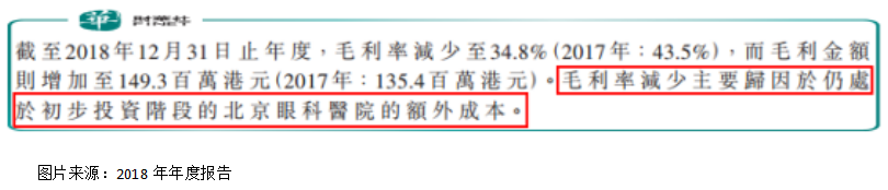 事实如此吗?对此我们翻看希玛眼科2018年的财报发现,公司解释毛利率下滑主要是由于处于初步投资阶段的北京眼科医院的额外成本。