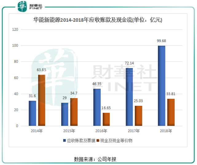 由于收款周期较长以及质保金制度问题,风电投资运营商巨额应收款难以快速变现,只能将压力及风险向风电产业链上游传递,而国家还没有出行之有效的政策进行解决。因此,应收账款巨大成为风电企业不得不面对的坎。2018年,华能新能源的应收账款和应收票据已接近百亿,达到99.682亿元(人民币,下同),占当年营收比重高达85.8%。
