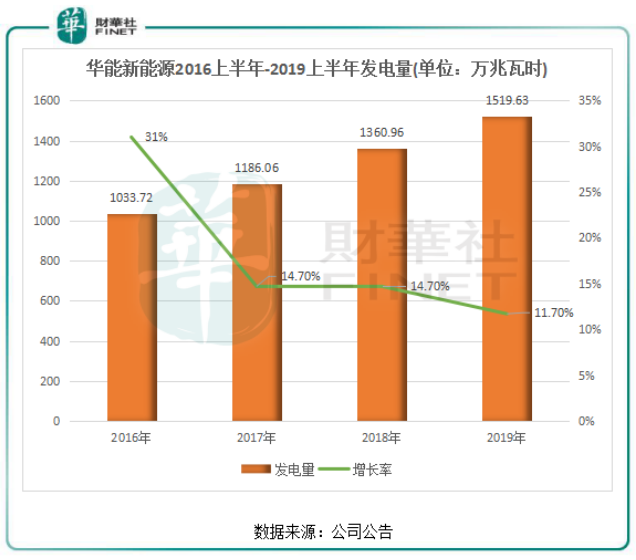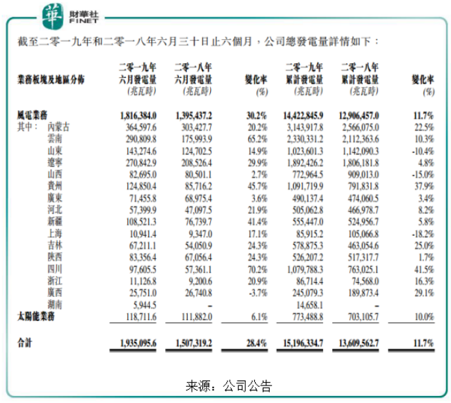 7月10日,华能新能源发布了今年上半年发电量情况。截至2019年6月30日止6个月,华能新能源完成总发电量1519.63万兆瓦时,同比增长11.7%。其中,风电发电量为1442.28万兆瓦时,同比增长11.7%,太阳能发电量为77.35万兆瓦时,同比增长10.0%。