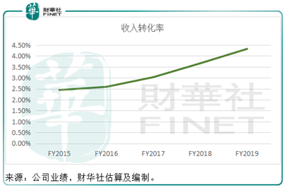 财华社用中国电商零售业务的年化GMV与国内零售网站成交金额估算出国内电商零售业务的收入转化率,见下图,由2015财年的2.44%提高至2019财年的4.32%, 反映消费者开支增加,或驱使更多商家购买增值服务,以把握商机。所以深化和优化服务或也是可行的增收方式。