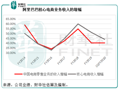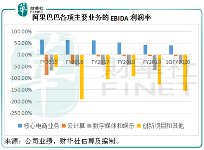 前文已提到中国的零售服务贡献了阿里巴巴大部分收入和全部盈利,即使到今时今日,这个局面依然没变。从下图可见,尽管基数不断扩大,阿里的中国电商零售业务仍保持强劲增长。但同时,财华社估算核心电商业务的经调整EBITA利润率也由2015财年时的64.52% ,下降至2019财年的42%,截至2019年6月底止的第1季EBITA利润率更进一步下降至41%。