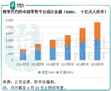 截至2019年3月31日止的财政年度,淘宝的商品交易金额(GMV)达到3.115万亿元,同比增长15.84%,天猫的GMV为2.612万亿元,同比增长22.57%,这两个平台的总成交金额同比增长18.81%,至5.727万亿元人民币。