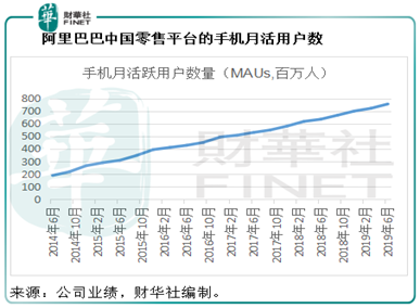 在中国广大剁手族的支持下,阿里巴巴得以茁壮成长。截至2019年6月30日止的12个月,中国电商零售业务贡献收入2692.48亿元,占核心电商业务总收入的76.11%,占阿里巴巴总收入的65.53%。截至2019年6月底止12个月,阿里巴巴中国零售平台的年度活跃消费者数达到6.74亿;截至2019年6月底,移动月活跃用户达到7.55亿。