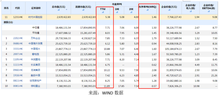 由WIND数据房地产开发总市值前10的房企来看,截至2019年11月5日,时代中国控股的市盈率(TTM)为5.38,低于房地产开发总市值前10的房企;市净率(PB)为1.46,和中位值1.5相近。值得注意的是,相比于万科企业(02202-HK)、中国恒大(03333-HK)、碧桂园(02007-HK)等大房企,时代中国控股的规模远低于它们,估值自然低于它们,但从时代中国控股近几年的营收、净利增速和经营情况来看,公司目前的估值也不高。
