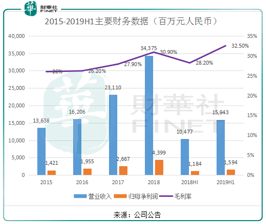 今年上半年来看,公司的毛利率达到近几年新高32.5%,较2018年上半年的28.20%高出4.3个百分点,公司的营业收入由2018年上半年的104.77亿元增长52.17%至2019年上半年的159.43亿元,归母净利润由2018年上半年的11.84亿元增长34.63%至2019年上半年的15.94亿元。