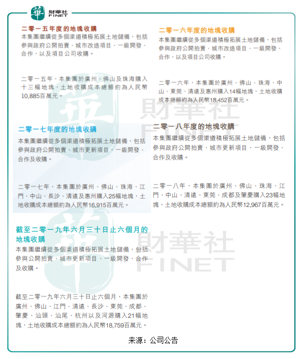 2015年至今,公司的收购力度不减。公司在2015、2016年、2017年、2018年及截至2019年6月30日止6个月的地块收购的金额分别是108.85亿元、184.52亿元、169.15亿元、129.67亿元及187.59亿元,短短四年半时间,公司收购地块金额高达779.78亿元,从收购地块的区域来看,大多集中于粤港澳大湾区及广东地带。