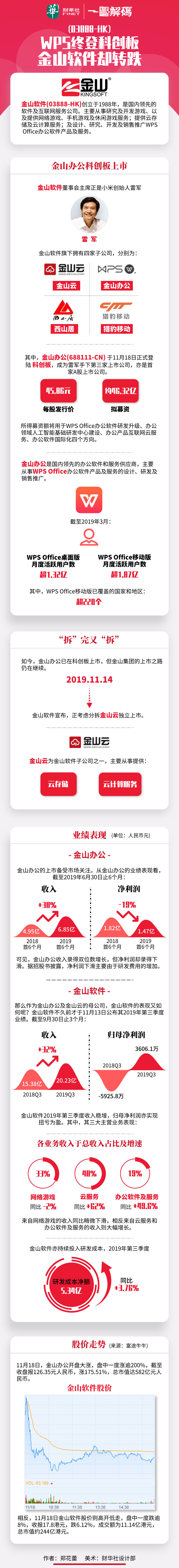11月18日,金山软件(03888-HK)旗下子公司金山办公(688111-CN)正式在科创板上市,每股发行价45.86元人民币。金山办公是国内领先的办公软件和服务供应商,其主要产品为WPS。金山办公挂牌后开盘一度涨逾200%;而金山软件却高开低走,当日收报17.8港元,跌6.12%。此外,金山软件旗下的金山云也正考虑独立上市。