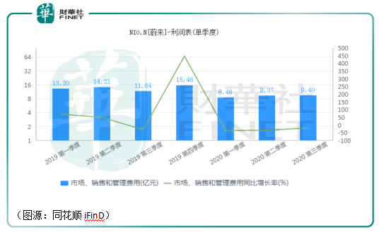 进入2020年后,蔚来裁去四分之一的员工,分拆充电业务NIOpower,并开设占地面积更小,成本更低的NIOspace门店。结果,蔚来去年市场销售管理费用显著下降,前三个季度费用均低于10亿元。