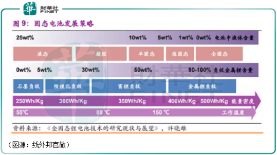 严格意义上说,电池中液体含量从25%降到0%, 能量密度对应从250Wh/kg一路升到500Wh/kg以上是一个从液态、凝胶、半固态向准固态、全固态电池进化升级的过程。