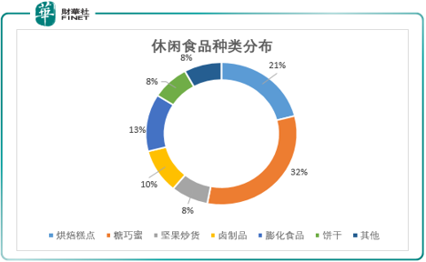 除了行业发展空间大,休闲食品行业的另一个特点是涵盖种类多样,整个行业中有许多细分赛道。例如糖果蜜饯、烘焙糕点、坚果炒货、卤制品、膨化食品等等都是休闲食品行业的细分赛道。从总体销售额来看,在细分赛道中占比最大的是糖果蜜饯类,其次是烘焙糕点和坚果炒货类。