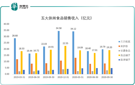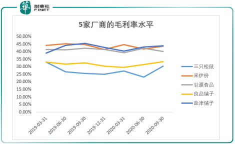 从5家公司的销售收入来看,截止到2020年第一季度,三只松鼠的销售规模在5家公司当中明显处于优势地位。但是这种优势并不明显,截止到2020年第三季度三只松鼠的销售规模就基本与良品铺子持平。