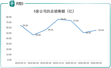 并且5家公司的销售额并不是出现此消彼长的态势,而是整体性的下滑。在2019年第四季度的时候5家公司的总销售额为76.06亿元,而此后几个季度5家公司的销售额开始出现逐年下滑的趋势,截止2020年第三季度已经下滑至55.54亿元。