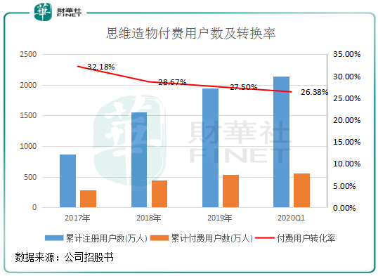 上图可见,思维造物的累计注册用户数由2017年的858.45万人翻超过一倍至1947.32万人,2020一季度增至2000万人以上。而付费用户数方面的增长速度则不如注册用户数快,2019年只比2017年多了250多万人。所以可以看到,思维造物的付费用户转化率不断下滑,2020年上半年为26.38%,较2017年下降了5.8个百分点。