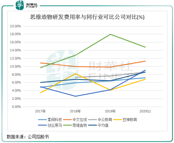 这些大V名师的演讲课程覆盖了多个学科领域,包括心理学、金融学、管理学、品牌营销、医学与健康等等。在大V名师汇聚了大量流量的同时,思维造物还重资搞研发,研发了基于人工智能、深度学习的个性化推荐、知识图谱等核心技术,成立专职教研团队进行课程研发,还与硬件厂商合作研发了“得到阅读器”以及研发听书、电子书等。2017年-2019年,其研发投入分别为5387.18万元、9411.36万元、1.13亿元,占营收比例为9.68%、12.75%、17.94%,2019年研发费用率远高于6.42%的行业平均值。