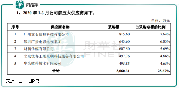 思维造物没有属于自己的讲师,2020年3月末总员工数量仅为389人,只有研发、内容、销售和管理人员。所以思维造物需要像一家工厂一样向外采购“商品”,在过去,该公司通过向传媒企业、软件企业(如华为)、广播电视集团以及个人等供应商“采购”讲师。2020年一季度,思维造物来自前五大供应商的采购额达到了3060.31万元,占采购总额的比例28.67%。