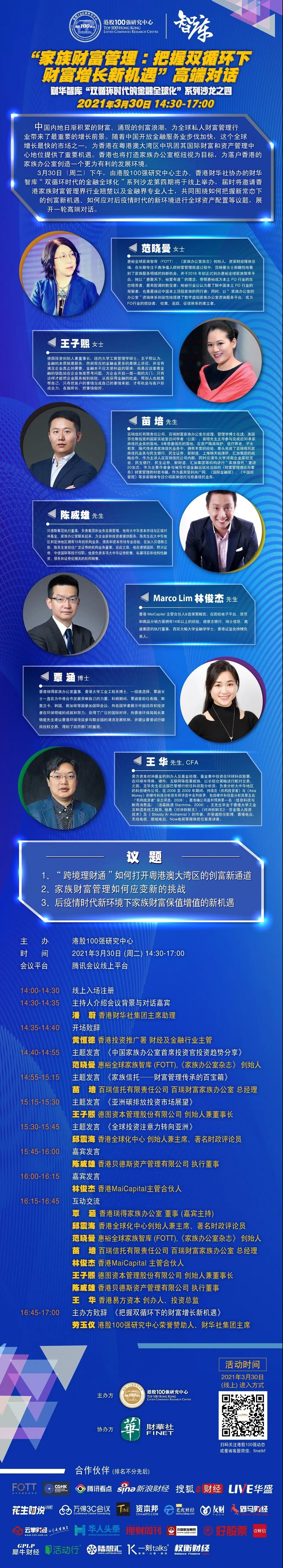 3月30日(今天)下午14:30,由港股100强研究中心主办、香港财华社协办的财华智库“双循环时代的金融全球化”系列沙龙第四期“家族财富管理:把握双循环下财富增长新机遇”高端对话将于线上举办。期待专业权威的分享,为您带来一场思想领域的饕餮盛宴!