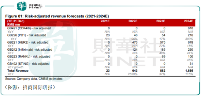 券商预测,今年开始嘉和生物的杰洛利单抗注射液(Geptanolimab,GB226)将会率先上市商业化贡献销售收入2300万元。2022年,GB221、GB242亦将获批上市并贡献销售收入4.73亿元及1.24亿元,全年公司总收入预计将达到6.43亿元。2024年,公司年销售收入将会大幅增至18.95亿元。