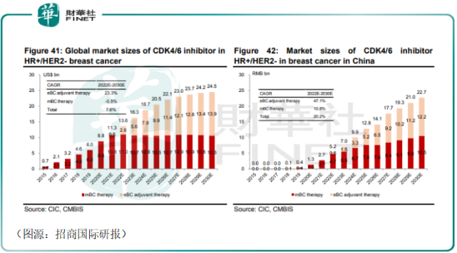 对应中国转移性乳腺癌CDK4/6抑制剂市场规模预计将从2022年的47亿元增长至2030年的105亿元,复合年增长率达到10.8%(见右下柱状图红色部分)。
