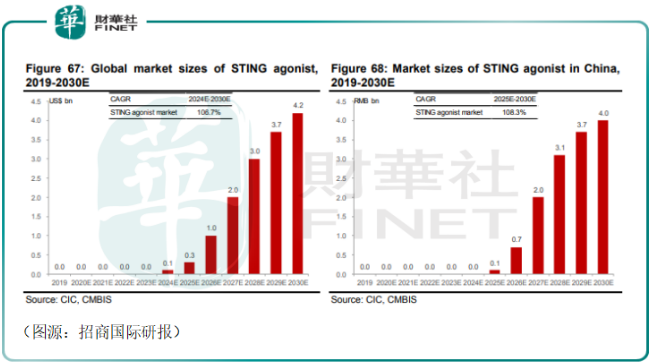 因此,全球STING激动剂市场最早亦只会在2024年开始才起步,至2030年行业规模将发展至42亿美元,复合年增长率107%。相比之下,中国市场则要更晚一年在2025年方开始起步,到2030年行业规模发展至40亿元,复合年增长率108%。