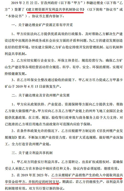 最终,融捷股份采取了与当地政府利益共享的机制,才得以顺利启动项目。2019年2月22日,融捷股份和甘孜州政府签署了利益共享协议书: