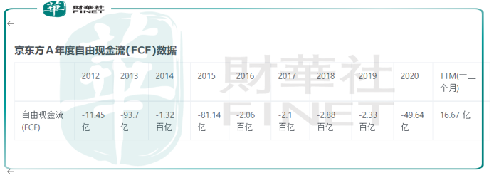 液晶显示行业受摩尔定律影响, 企业需要通过不断地投入让新生产技术降低成本从而淘汰旧技术,研发烧钱的力度可见一斑。同时,面板是重资产行业,前期需要投入大量现金,因此京东方的现金流情况一直不太理想,公司的自由现金流长期为负。