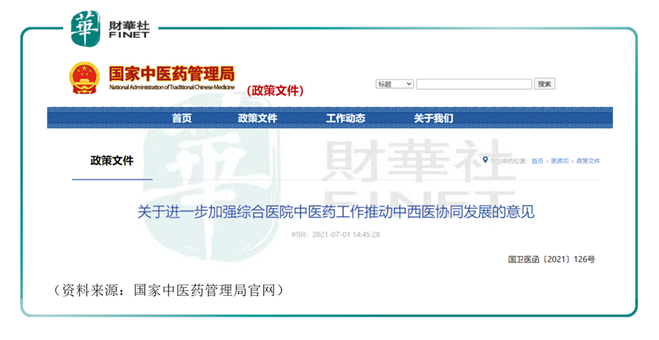 7月1日,国家中医药管理局发布国卫医函〔2021〕126号《关于进一步加强综合医院中医药工作推动中西医协同发展的意见》。
