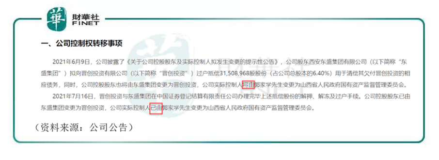 据公司公告,6月9日,公司披露了《关于公司控股股东及实际控制人拟发生变更的提示性公告》,公司股东西安东盛集团有限公司拟向晋创投资有限公司过户抵偿31,508,968股股份(占公司总股本的6.40%)用于清偿其欠付晋创投资的相应债务,同时,公司控股股东也将由东盛集团变更为晋创投资,公司实际控制人将由郭家学先生变更为山西省人民政府国有资产监督管理委员会。