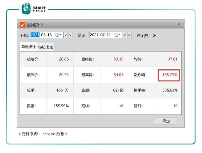 6月9日公司公告变更实控人消息发出后的当天,广誉远股价以涨停板报收,回调3天后连续拉板。从6月16日至7月21日,累计涨幅高达155.75%,换手率高达335.63%,主力动用了200多亿元的资金参与了操作,妖股特性明显。