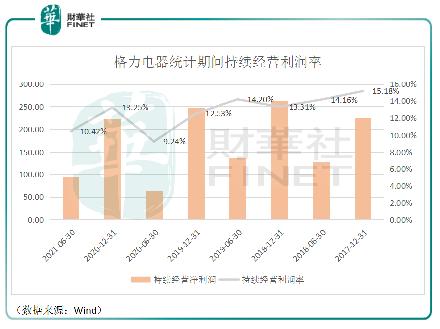 按持续经营利润率来看,格力今年上半年持续经营利润为94.9亿元,对应利润率10.4%。在过往四年统计期间,格力10%左右的持续经营利润率只低于2020年年中公司受困疫情的至暗时刻。