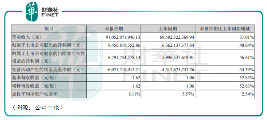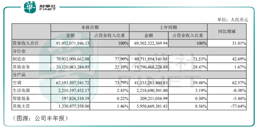 公司8月22日披露的中报显示,格力电器上半年营收录得910.5亿元,同比增长31%;归母净利润94.57亿元,同比增长48.6%;基本每股收益1.62元,同比增长52.83%。