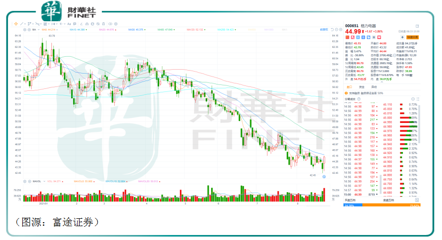 今年年内,格力股价近乎是没有什么挣扎的下行。年初公司股价还站在63+元水平,至8月23日收市,格力最新股价收报45元。