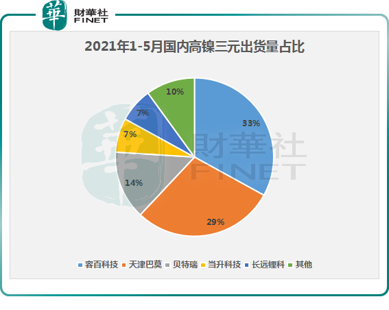 截至2021年6月,国内高镍材料(包括NCM811、NCA和NCMA等)产量占三元材料的比例已从2020年的21.9%提升至40%。