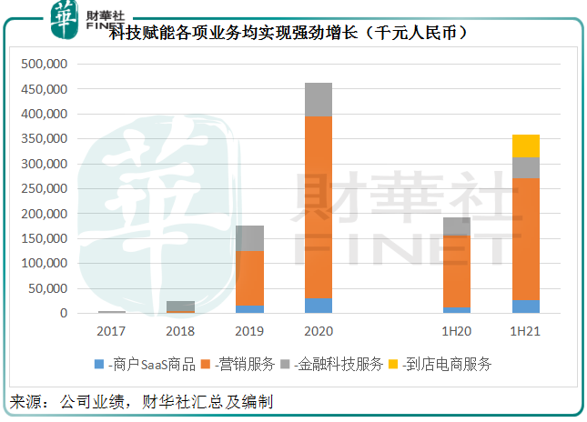 2021年上半年,这些科技赋能业务都取得了理想的增长,其中商户SaaS收入贡献更同比大增1.34倍,达到2733.7万元。