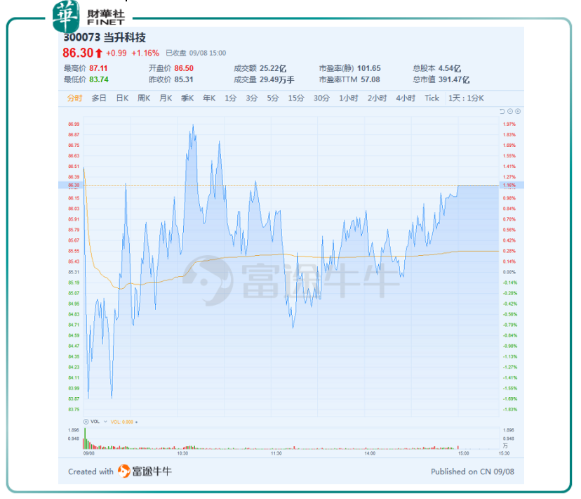 9月8日,公司股价开盘后快速回调,5分钟内跌幅近2%,随后逐渐回升,盘中股价最高触及87.11元,截至收盘,股价上涨1.16%,收盘价为86.30元,创下历史新高。