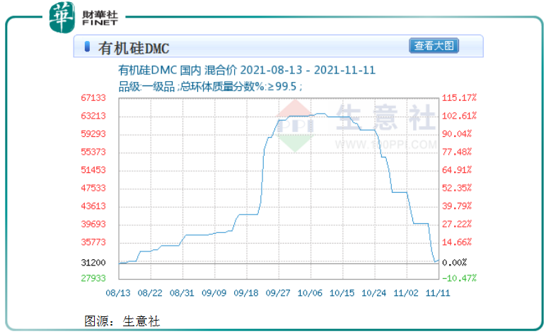 不过,自10月中旬开始,有机硅DMC价格开始出现大幅下滑。据生意社数据显示,有机硅DMC价格从10月12日的6.31万元/吨下滑至11月11日的3.21万元/吨,累计降幅达50%。