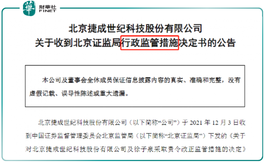 为此,捷成股份、公司控股股东徐子泉、时任总经理陈同刚、时任财务总监张文菊被北京证监局采取责令改正的监督管理措施,并计入证券期货市场诚信档案。此前的2021年11月19日,捷成股份及上述责任人也被深交所采取了通报批评的处分。