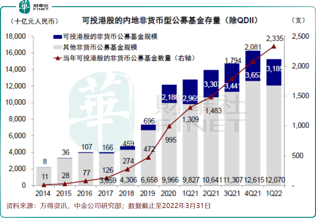 截至一季度末,內地可投港股的公募基金(扣除QDII)总计2335支,总资产约3.2万亿人民币,分別占9413支非货基和15.2万亿人民币总规模的24.8%和20.9%,虽然较2021年第四季度增加了252支,但是规模缩减了4717亿人民币,这也是自2014年沪港通开通以来首次出现下降。