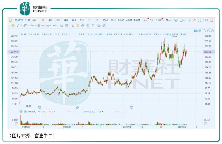 经统计,自上市初至2022年6月2日,该公司的股价(前复权)在差不多3年的时间里累涨超过450%,表现比较优异。