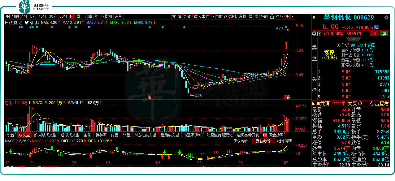 值得一提的是,攀钢钒钛近日表现尤为强势,至今已连收3板,报收5.06元/股,盘后仍有超37万手买单排队抢筹。
