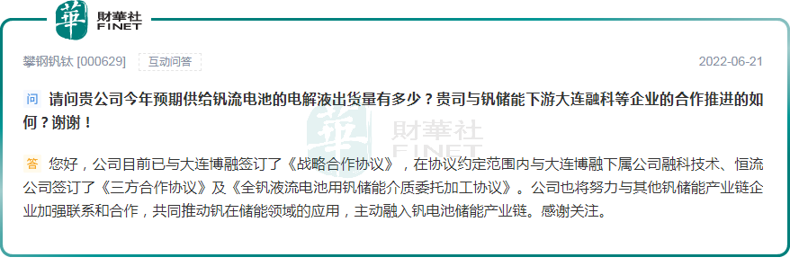6月21日,攀钢钒钛在互动易平台强调称,公司目前已与大连博融签订了《战略合作协议》,在协议约定范围内与大连博融下属公司融科科技、恒流公司分别签订了相关协议。