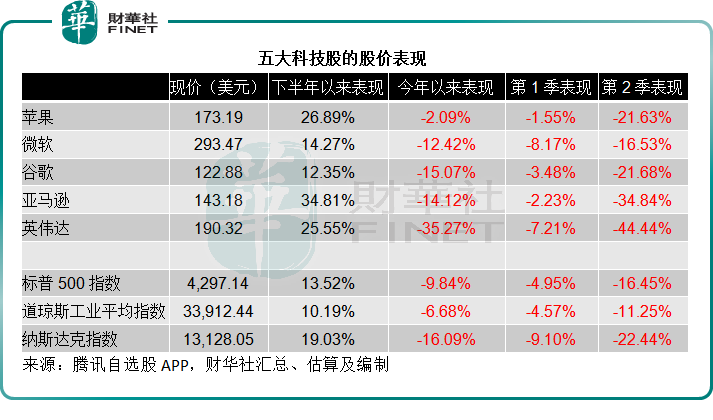 见下图,苹果、微软、谷歌、亚马逊、英伟达五支市值最高的科技股在第2季累计下挫双位数,跑输美股三大指数标普、道指和纳指。