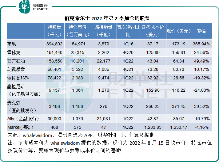 同时,加仓了9只股票,包括已经占了其投资组合逾40%的苹果,并继续加仓油公司雪佛龙和西方石油,以及娱乐公司动视暴雪(ATVI.US)和派拉蒙环球(PARA.US)见下表。