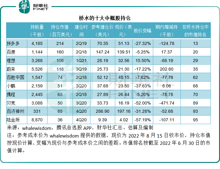 一直表示看好中概股的桥水,中概股在其投资组合中不算特别突出,持仓最多的中概股拼多多(PDD.US)在其组合中的持股市值仅排到13,而且在2022年第2季,桥水减持了大部分持仓较重的中概股,见下表。