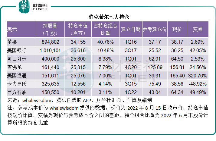 截至2022年6月30日,伯克希尔最大的持仓股为苹果,雪佛龙和西方石油也挤进了前七大持仓,显示出伯克希尔对于能源前景的看涨,另外金融股的持仓占比也较高,两大金融机构合起来的占比达到17.48%,消费品股可口可乐(KO.US)和卡夫亨氏(KHC.US)继续保有一席之地。